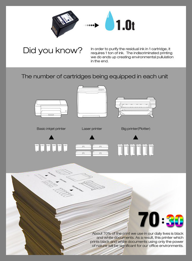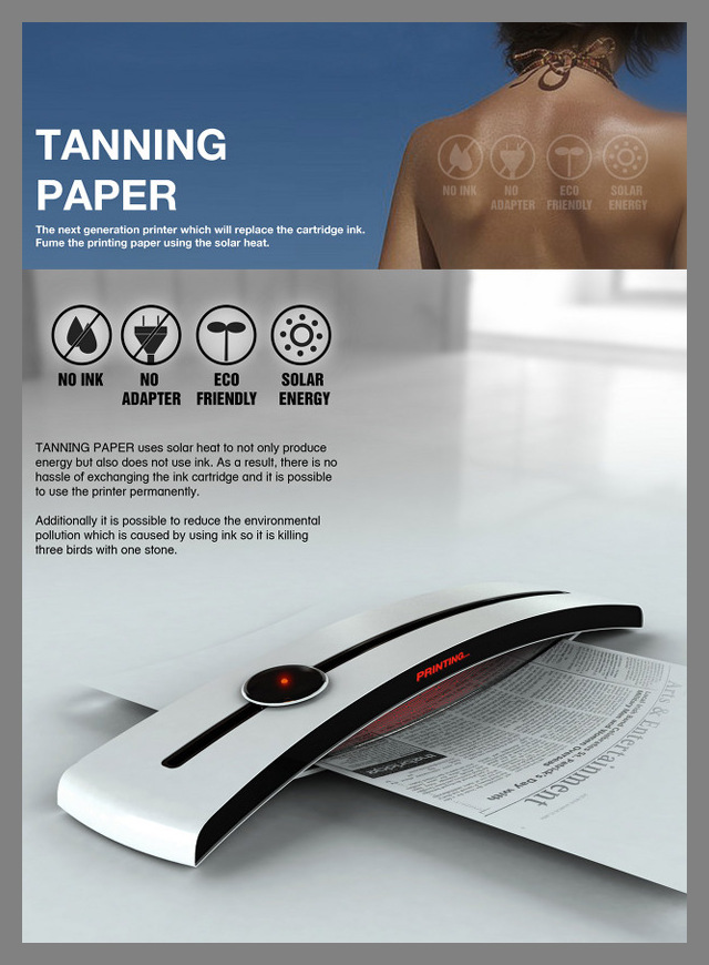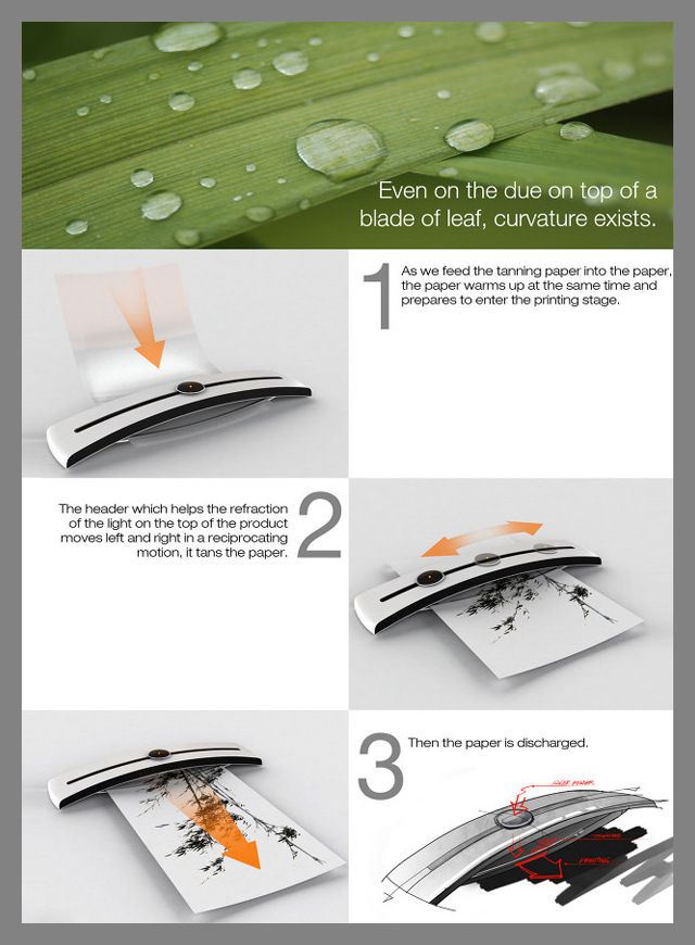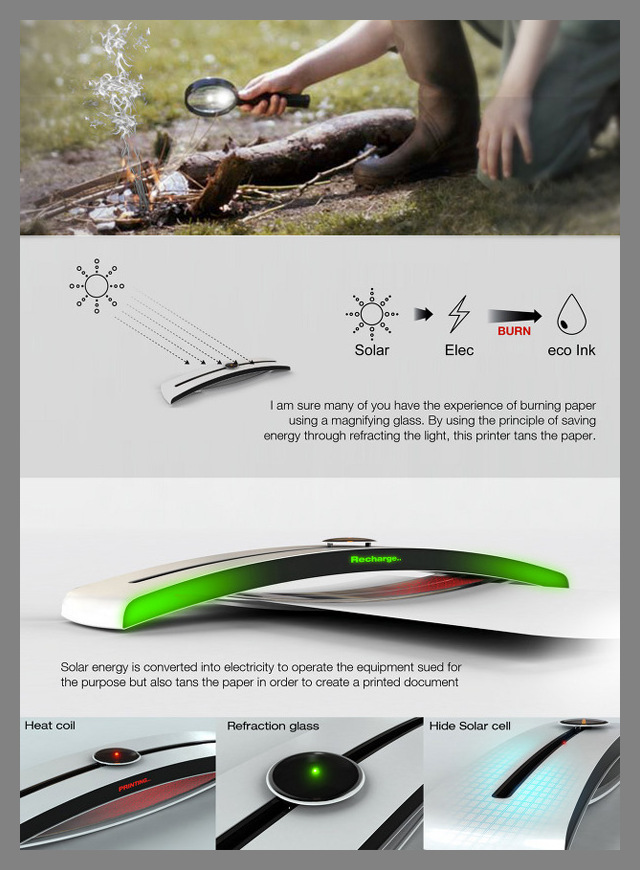 Alternative engines that run on solar energy do not represent a new idea anymore. Though, the team of technical designers originated a concept of a removable printer is not charged by solar energy, but uses it as ink. If viewing deeper, the device acts as a solar parlor for paper. Seungin Lee, Hosung Jung, Junsang Kim and Yonggu Do created a device of new generation that uses converted sun beams to burn the upper layer of the paper and in this way shaping letters or producing black-and-white images.